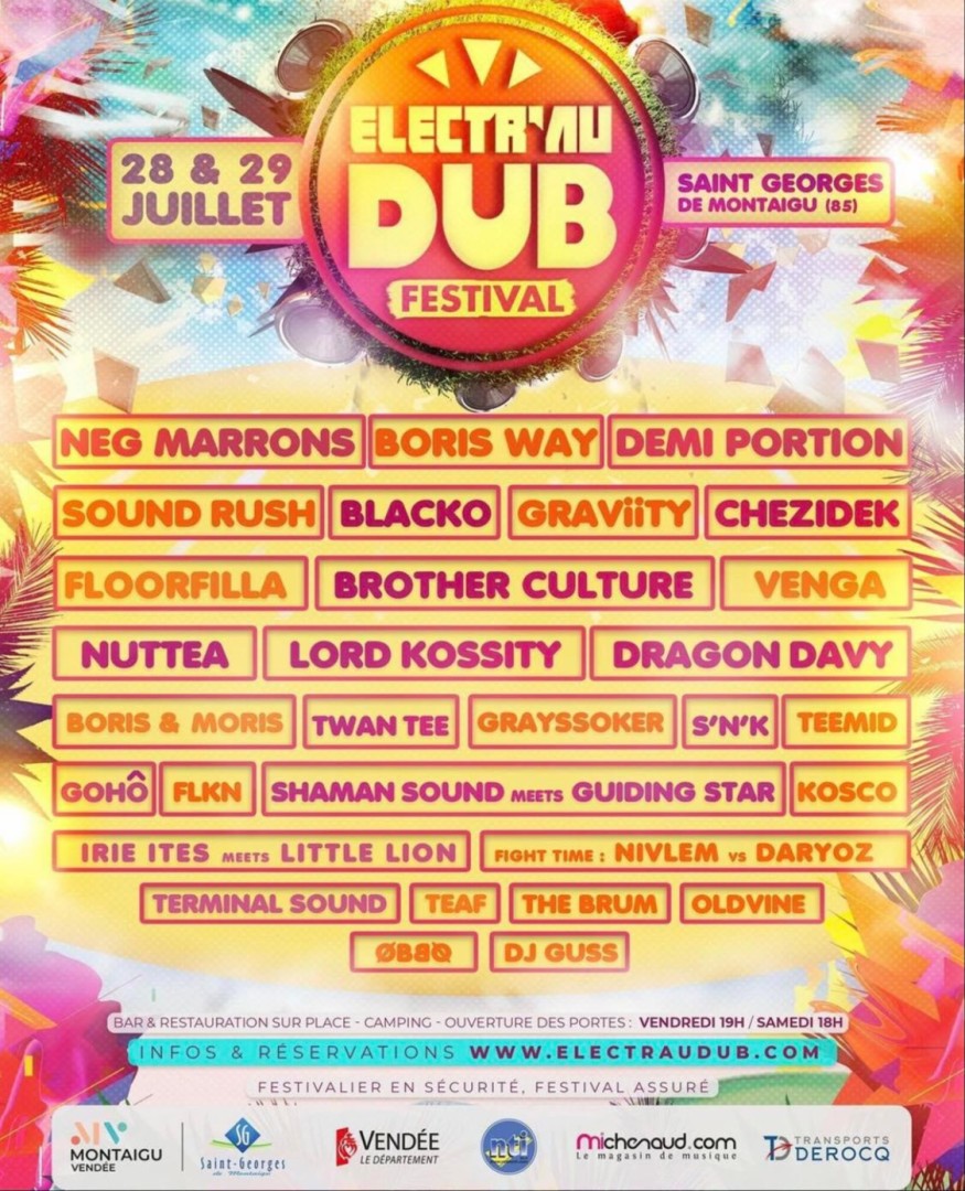 - ELECTR'AU DUB Festival 2023 - Toute la programmation de l'electr'au dub festival 2023 a été dévoilée, ne perdez pas plus de temps et prenez vos billets pour venir découvrir sur scène des artistes de qualité se partageant nos 2 scènes (Reggae et Electro) sur 2 jours dans une ambiance festive... Cliquez sur "Voir plus..." pour afficher la programmation complète !